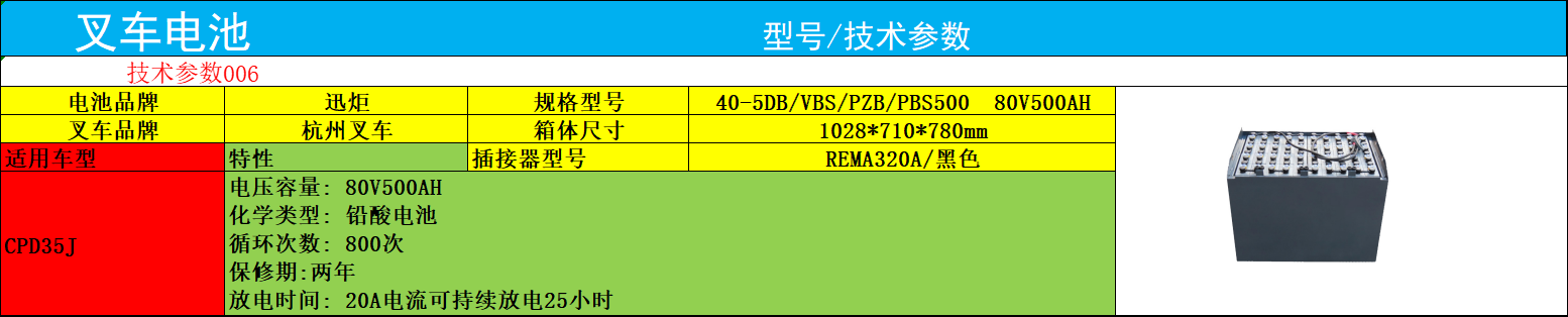 杭州叉车蓄电池CPD35 迅炬40-5PBS500 杭州3.5吨叉车电瓶80V500AH
