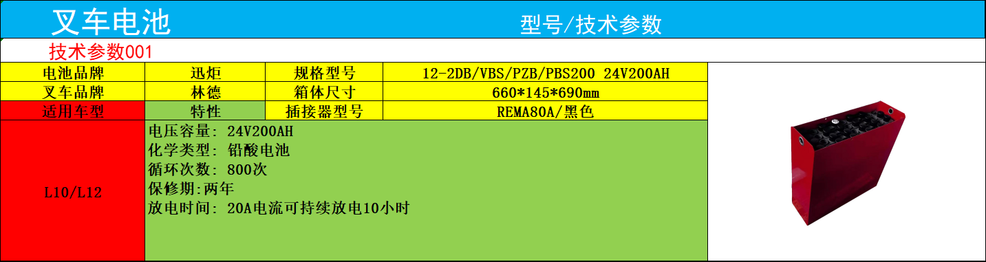林德叉车蓄电池L10 迅炬12-2PBS200电动搬运托盘车蓄电池24V200AH厂家林德搬运托盘车电池12-2PZB200是专为L10型号轻型搬运托盘车定制的核心动力组件,以24V额定电压与200AH大容量的精准配置,成为仓储物流短途转运场景的优选方案。这款林德搬运托盘车电池由12只2V单体铅酸电池串联而成,严格遵循林德内部设计与生产标准,通过酸循环化成工艺确保电压输出均衡,完美匹配L10托盘车