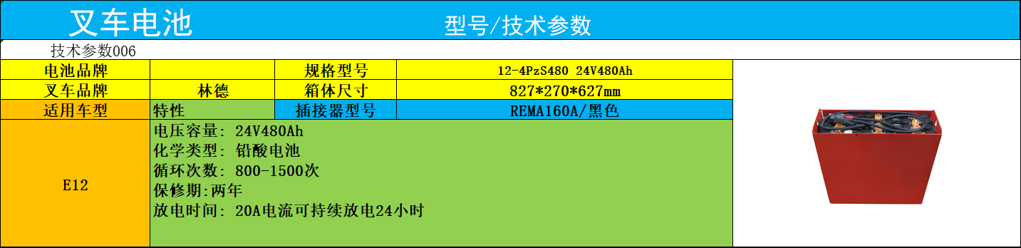 无论是狭窄货架间的货物堆垛,还是生产线旁的原料转运,林德叉车蓄电池12-4PZS480都以适配性强、性能可靠、维护简便的特质,成为E12叉车不可或缺的动力核心,完美契合现代物流的高效运营需求。