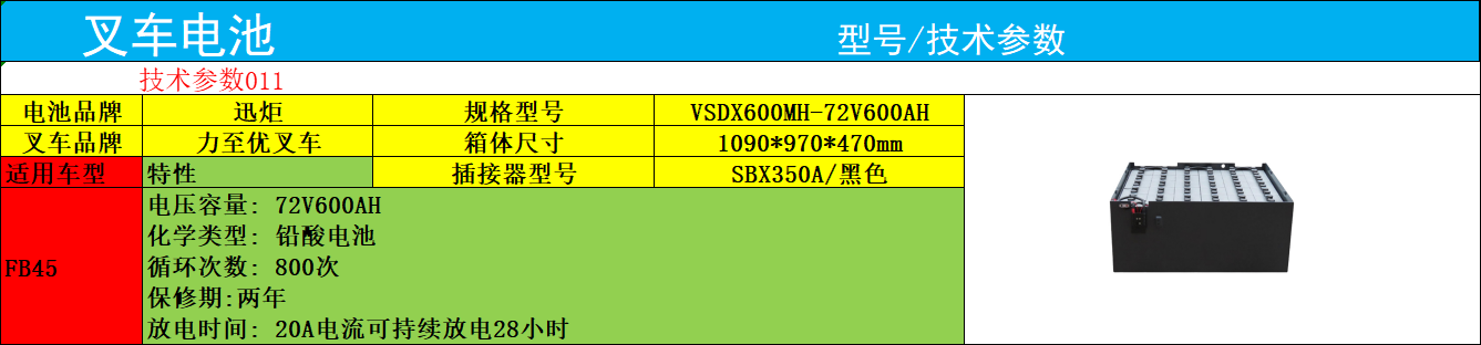 力至优叉车电池FB45 迅炬叉车电池组锂电池型号规格VSDX600MH 72V600AH迅炬VSDX600MH叉车电池组是专为力至优FB45系列4.5吨级重型叉车定制的核心动力组件,这款叉车电池组以72V高额定电压、600AH超大容量为核心亮点,搭配1090×970×470mm的精准铁箱尺寸,能完美契合力至优FB45的电池舱结构——无需任何切割改装即可实现无缝安装,即便叉车承载满负荷货物穿梭