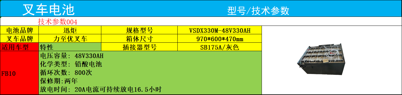 力至优叉车电池FB10 迅炬1吨叉车电池组VSDX330M 48V330AH价格迅炬VSDX330M叉车电池组是专为力至优FB10系列叉车量身打造的定制化动力组件,作为适配该叉车型号的核心能源产品,这款叉车电池组以48V额定电压、330AH大容量为核心优势,搭配970×600×470mm的精准铁箱尺寸,能完美契合力至优FB10叉车的电池舱结构——无需进行任何额外改造即可实现无缝安装,安装后即