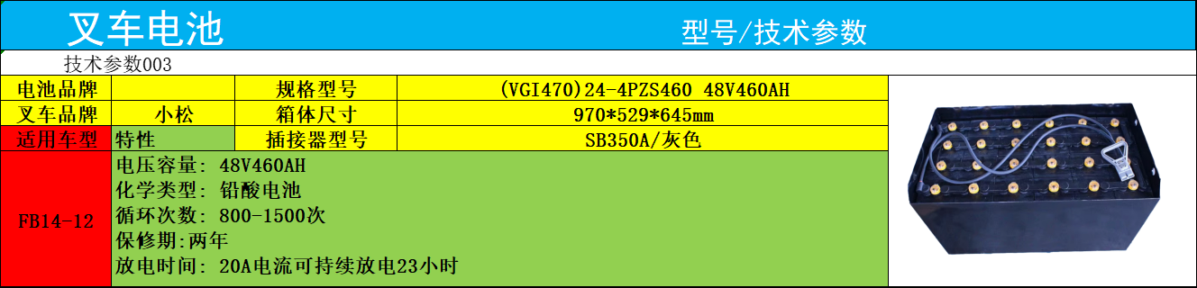 小松叉车专用锂电池VGI470 迅炬48V470AH电动叉车电池型号规格作为深耕叉车专用锂电池领域的实力厂家,我们针对小松FB14-12量身定制的电动叉车电池型号VGI470,凭借精准适配性与硬核性能,成为仓储物流场景的核心动力选择。这款叉车专用锂电池VGI470严格遵循48V470AH的核心规格设计,铁箱尺寸精准把控在970X529X645MM,与小松FB14-12的电池安装舱完美契合,无需额外