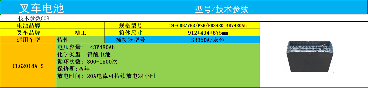 柳工电动叉车电池CLG2018A-S 迅炬24-6PBS480仓储叉车电池48V480AH规格表柳工CLG2018A-S作为仓储场景的主力电动叉车,其专用柳工电动叉车电池与仓储叉车电池核心型号为24-6PBS480,而专业电池品牌迅炬针对该车型量身打造的这款6PBS480电池,精准匹配48V480AH规格,完美嵌入叉车紧凑动力舱,成为迅炬在仓储电动叉车电源领域的标杆产品。作为深耕场景化电池研发的品