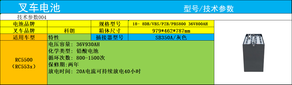 科朗RC5500牵引蓄电池36V800Ah Crown叉车18-8PBS800迅炬蓄电池配置表