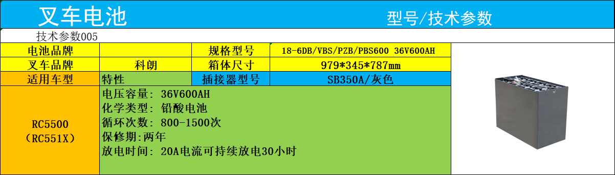 科朗叉车RC5500系列叉车电池18-6PBS600 迅炬叉车RC551X电瓶安装参数36V600AH