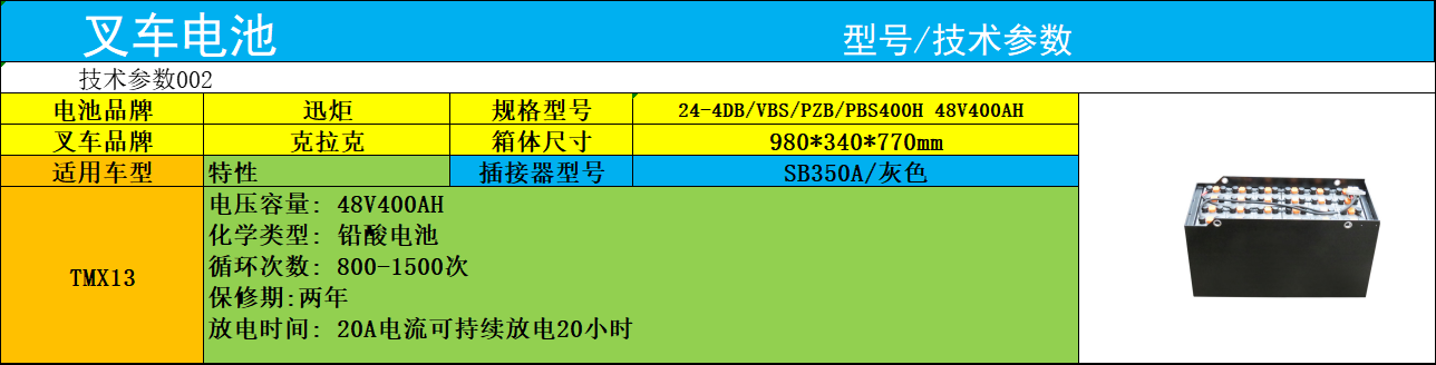 迅炬关联克拉克TMX12叉车电池(24-4PBS400H 48V400AH)参数及应用简介