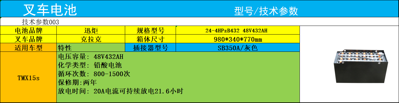 迅炬关联克拉克TMX15S叉车电池(24-4HPZB432 48V432AH)参数及应用简介